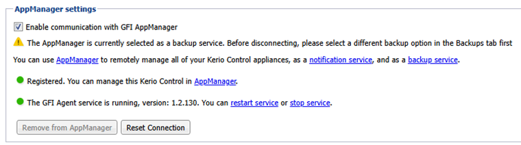 3. In the GFI AppManager settings section, click the Reset Connection button.
