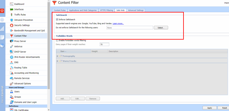 - In the administration interface, go to Content Filter > Safe Web.