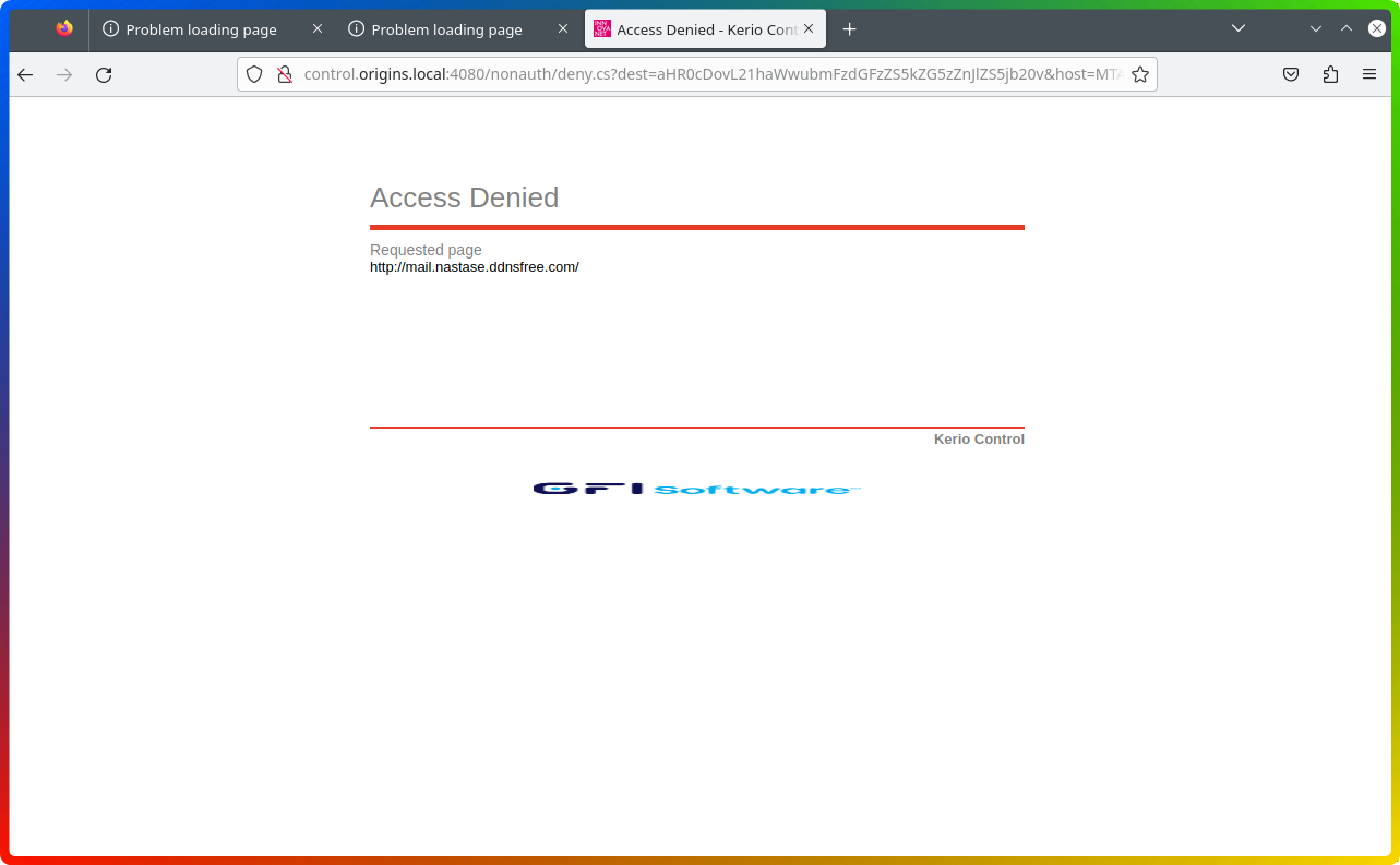 When using Kerio Control, you may encounter issues where legitimate websites are blocked due to content filter rules. This can result in an "Access Denied" banner appearing for users.